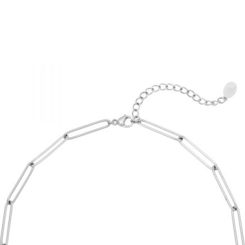 Deze korte ketting (chokerlengte) bestaat uit langwerpige grote schakels van stainless steel, blijft dus mooi!