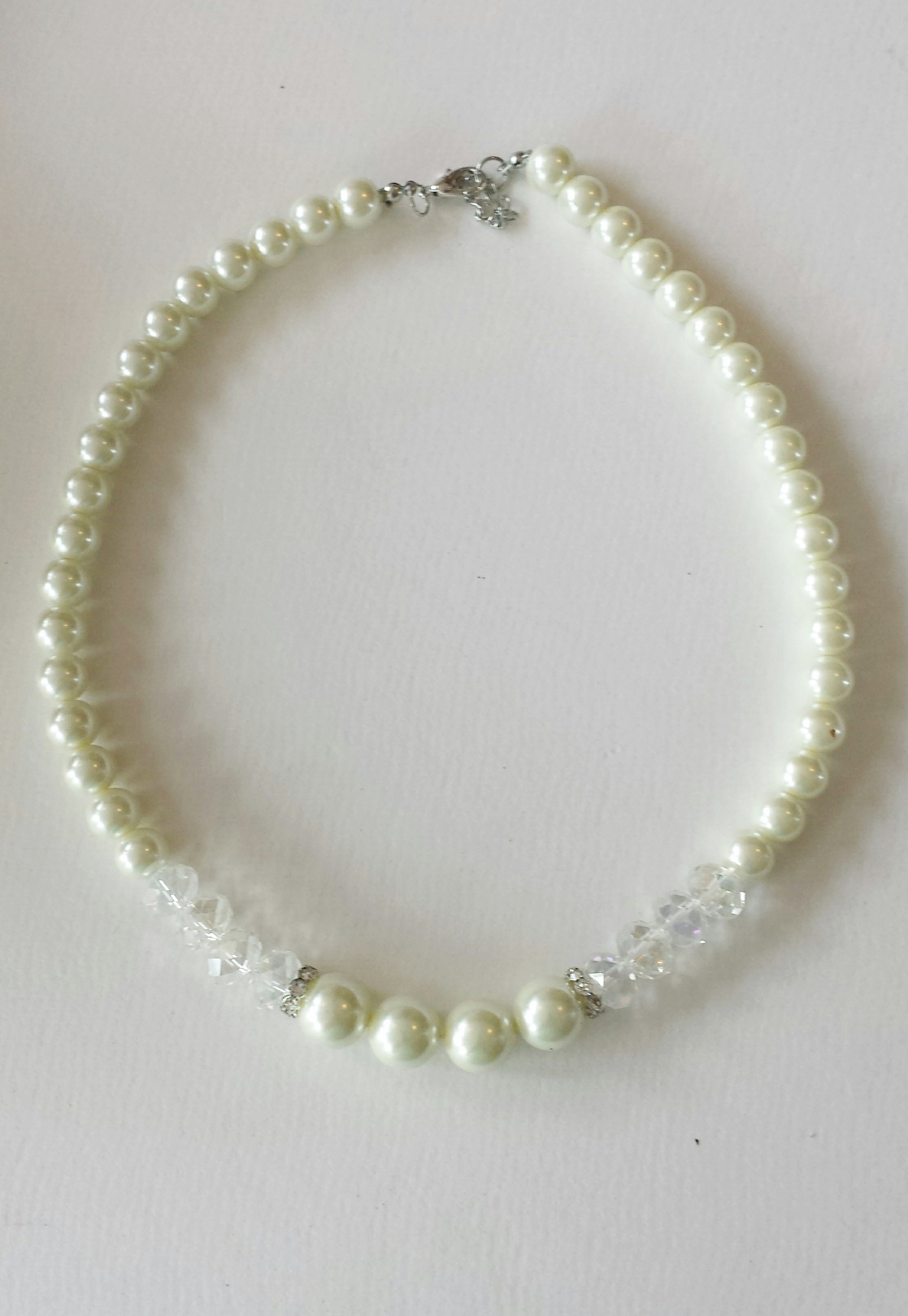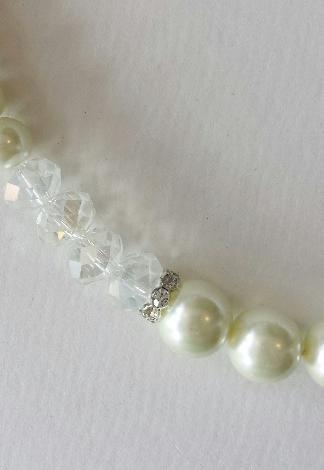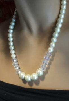 Deze ketting heeft witte parels aan de bovenkant en grote parels aan de voorkant met daartussen grote kralen van kristal die mooi schitteren.