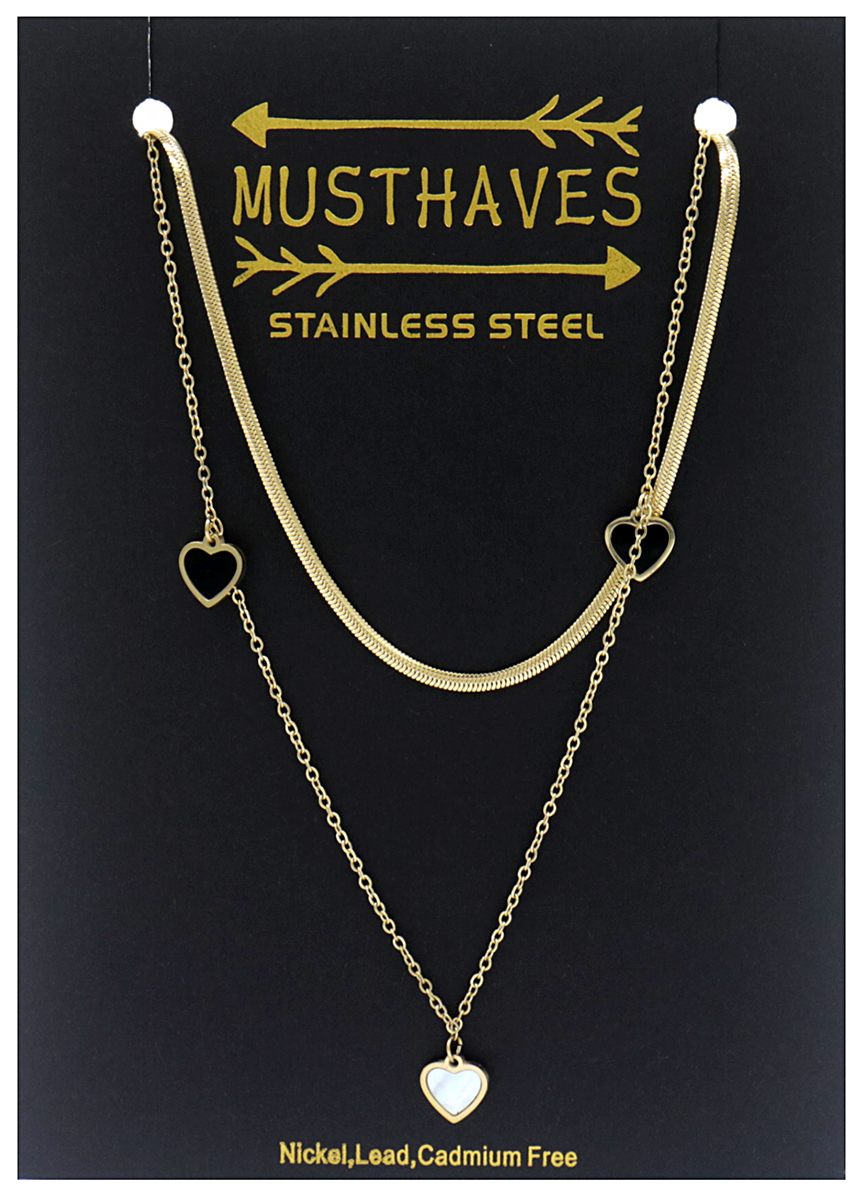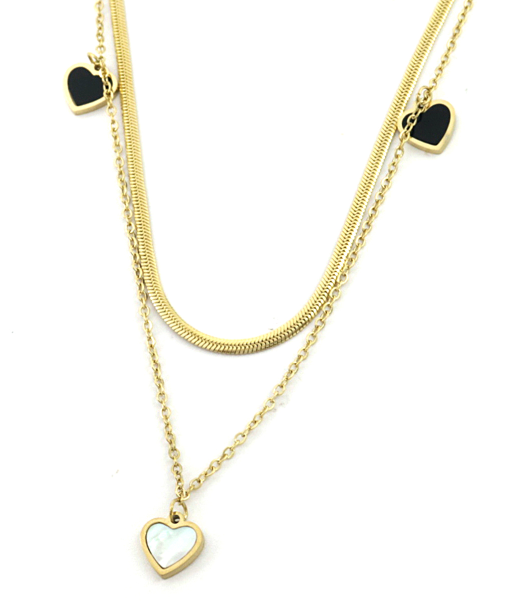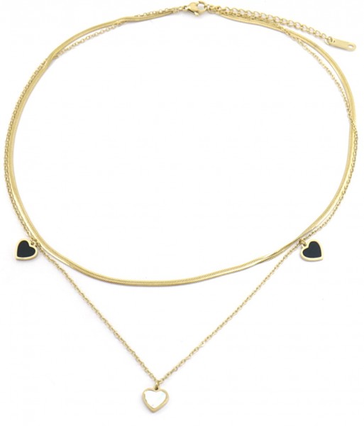 Deze ketting bestaat uit 2 laagjes onder elkaar, waarvan de kortste platte snake schakels (2 mm) heeft en de langste fijne (1,5 mm) schakels met hartjes. Van de hartjes zijn er 2 met zwart en 1 met een witte parelmoerglans (schelp) ingelegd.