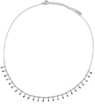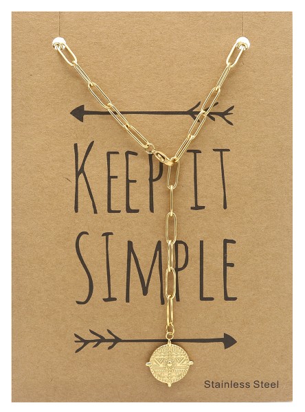 Deze korte ketting in bestaat uit grote lange schakels (3,5 x 11 mm) met een Aztec gedecoreerd muntje onderaan. Van stainless steel zodat hij lang mooi blijft! Je kunt zelf bepalen met het slotje hoe lang het muntje hangt want dat is ook de sluiting.