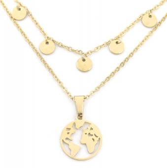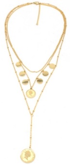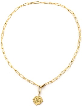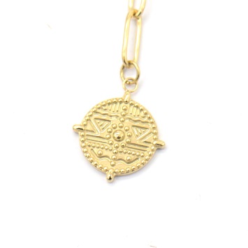 Deze korte goudkl. ketting bestaat uit grote lange schakels (3,5 x 11 mm) met een Aztec gedecoreerd muntje onderaan, van stainless steel!