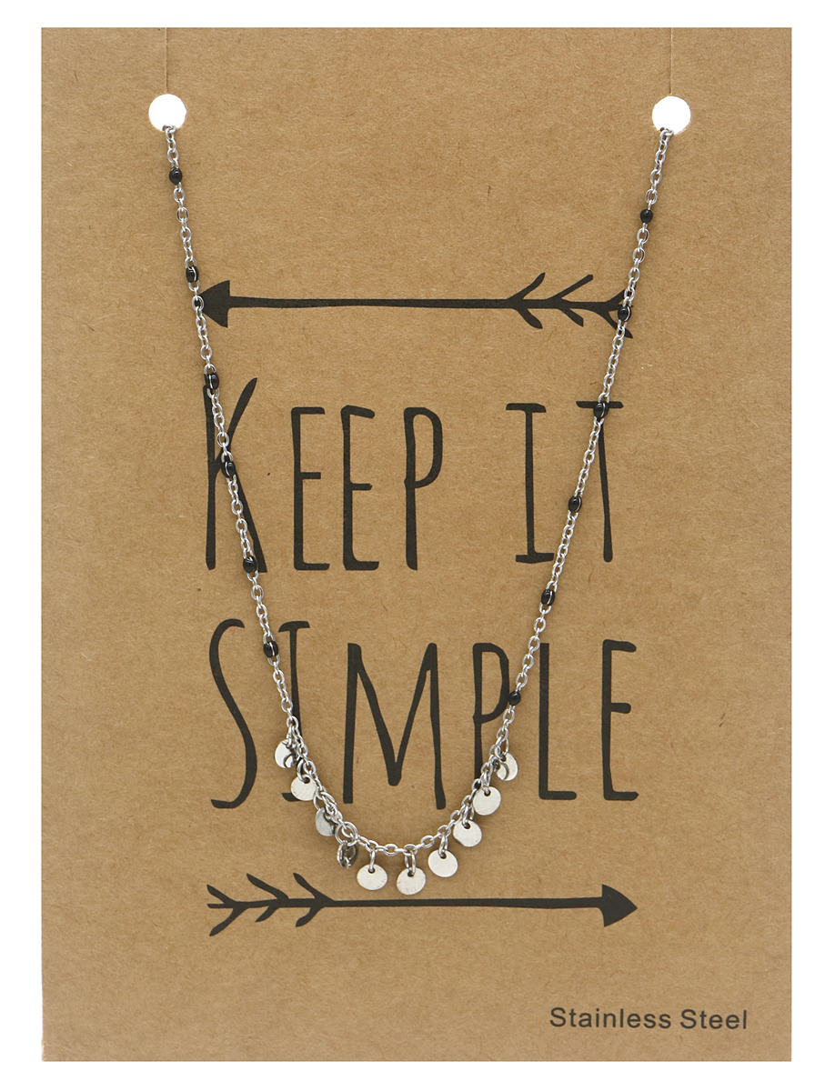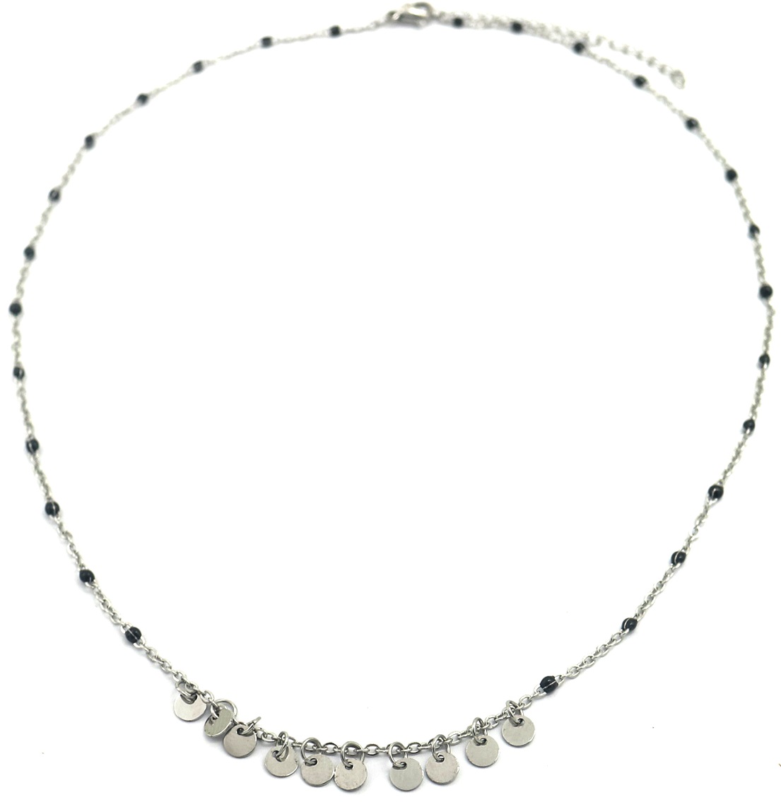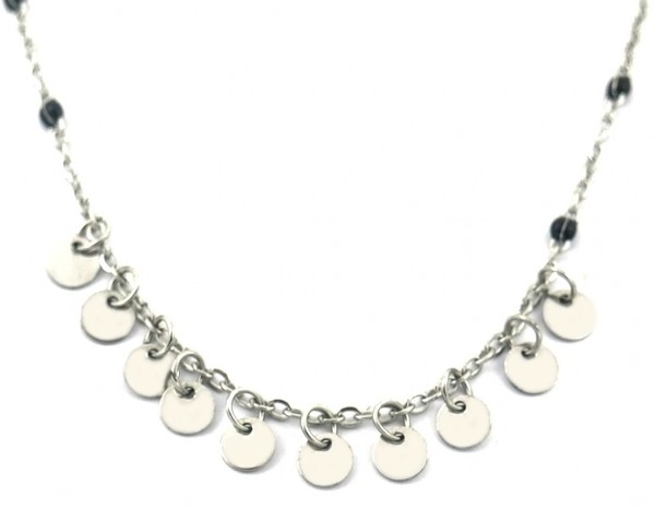 Dit fijne (1,5 mm) zilverkleurige kettinkje heeft zwarte kraaltjes tussen de schakeltjes en in het midden kleine zilveren muntjes, helemaal leuk! Ook is deze ketting gemaakt van stainless steel zodat hij lang mooi blijft.