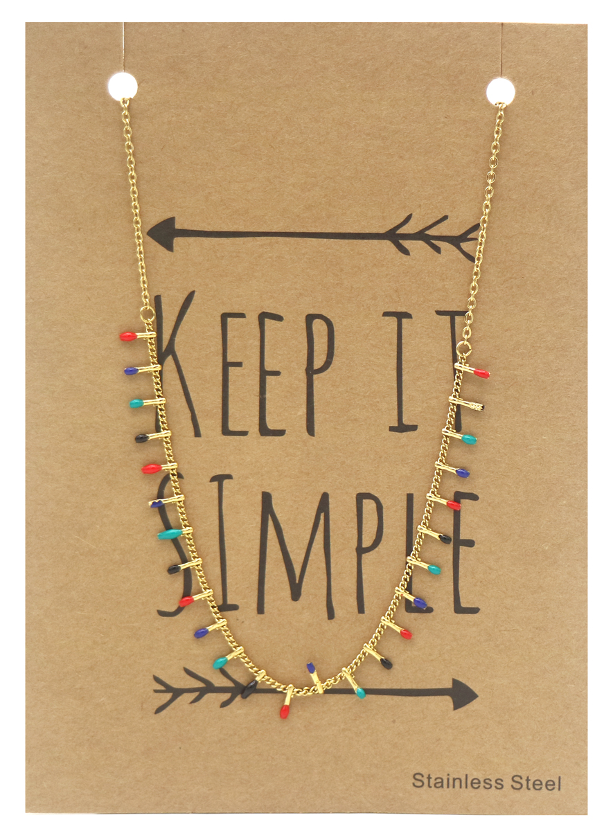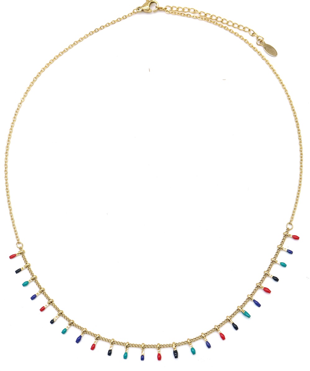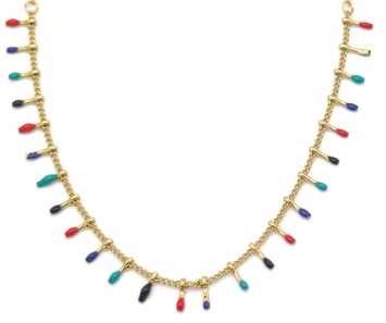 Deze korte fijne (1 mm) ketting heeft als decoratie kleine staafjes met een gekleurd verfdruppeltje op elk staafje.