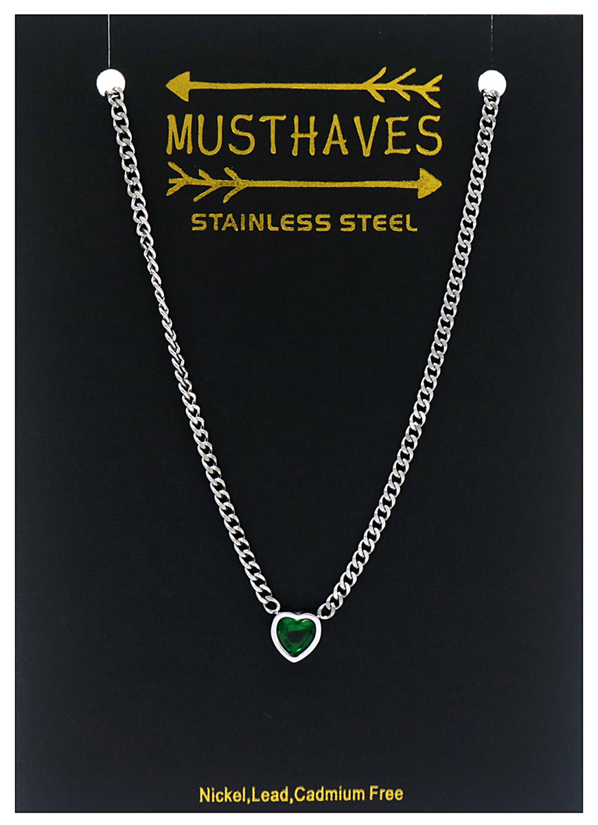 Deze ketting heeft schakels van 3 mm en een hart met groen kristal in het midden, de ketting zelf is van stainless steel, blijft dus mooi!