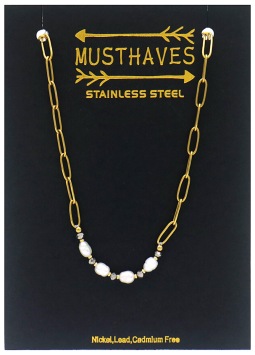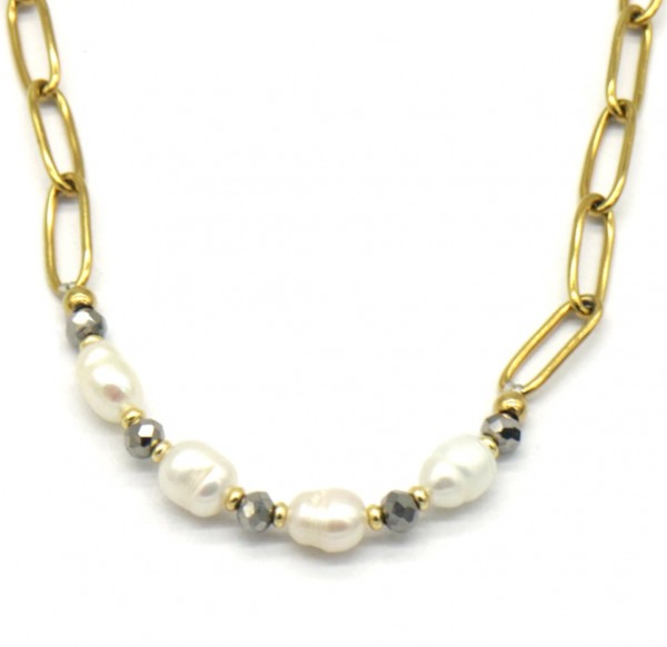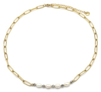 Deze ketting heeft langwerpige schakels met zoetwaterparels in het midden, de ketting zelf is van stainless steel, blijft dus mooi!