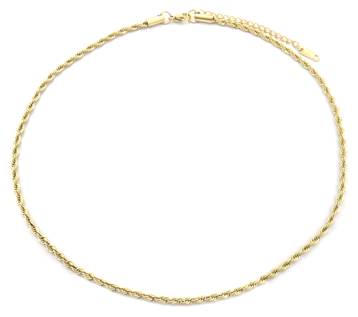 Deze korte ketting heeft gedraaide schakels en is ong 3 mm dik. De gedraaide ketting is van stainless steel (RVS) zodat hij lang mooi blijft! De lengte is verstelbaar van 41-46 cm.