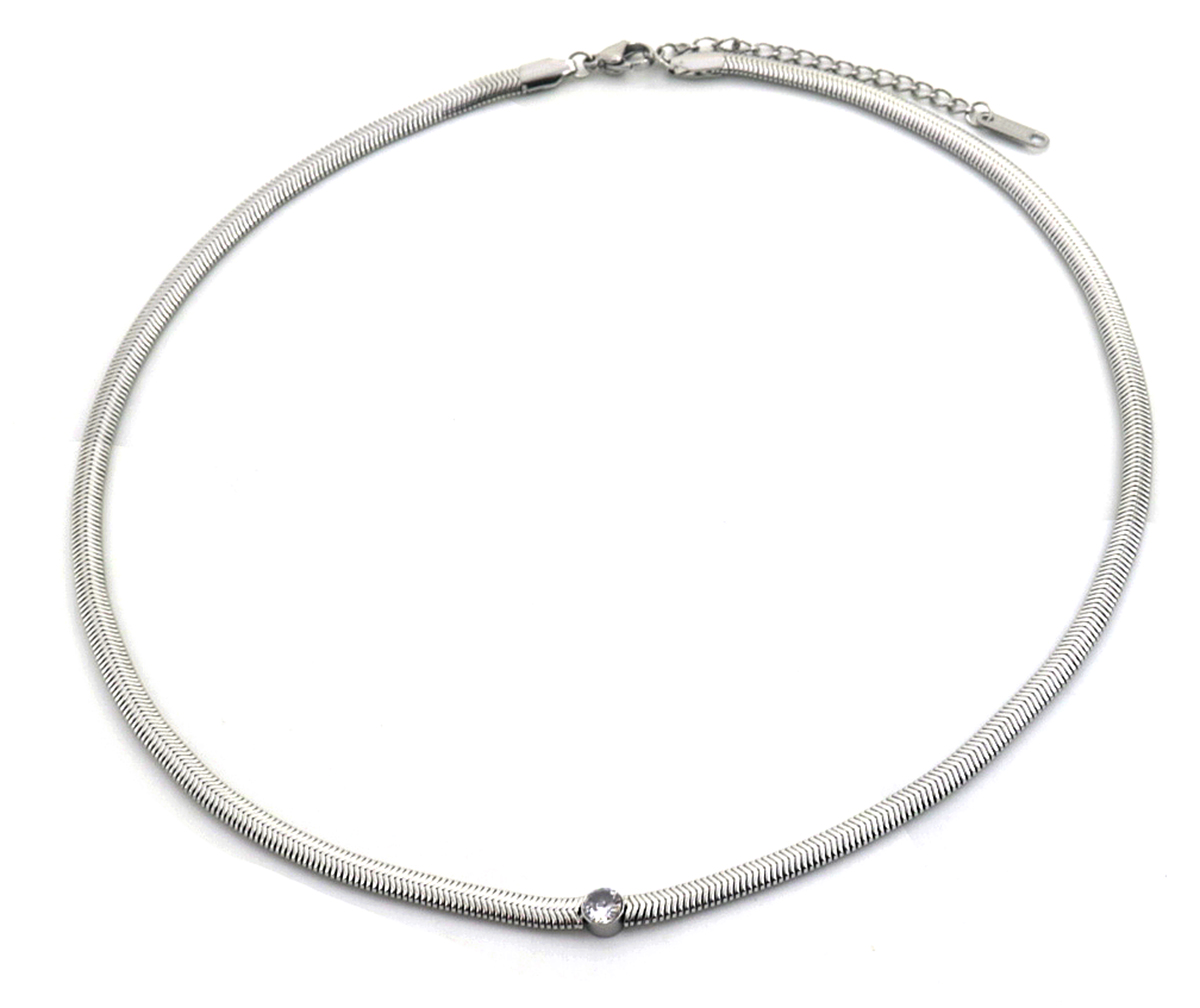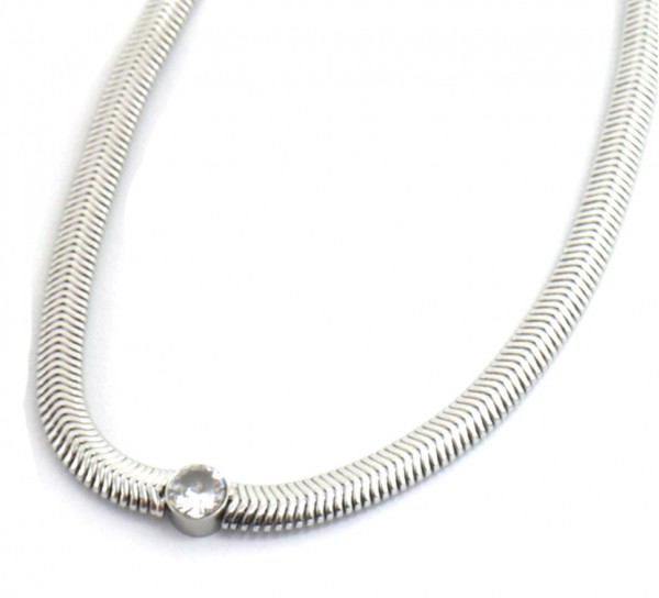 Korte platte snake ( 4 mm) ketting met in het midden een Zirconia steentje, wat mooi schittert als een diamantje! De ketting is van stainless steel zoadet hij lang mooi blijft