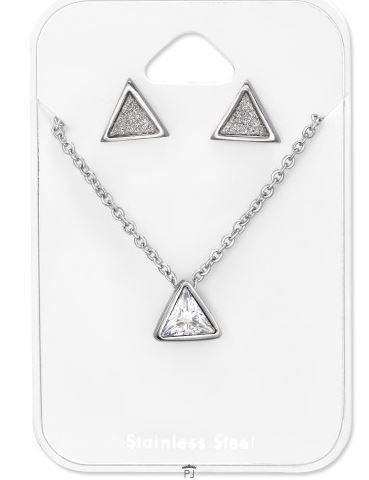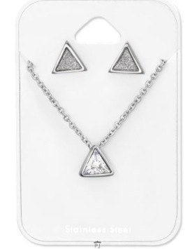 Deze kettingset bestaat uit een fijne (1 mm) stainless steel ketting met als hanger een kleine driehoek met strass-steen ('diamant', en een set oorbellen (studs) in driehoek model met glittereffect, apart!