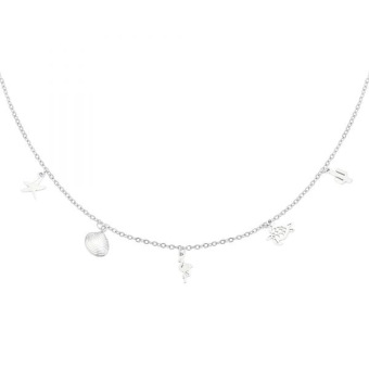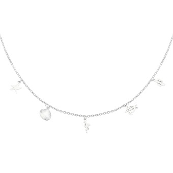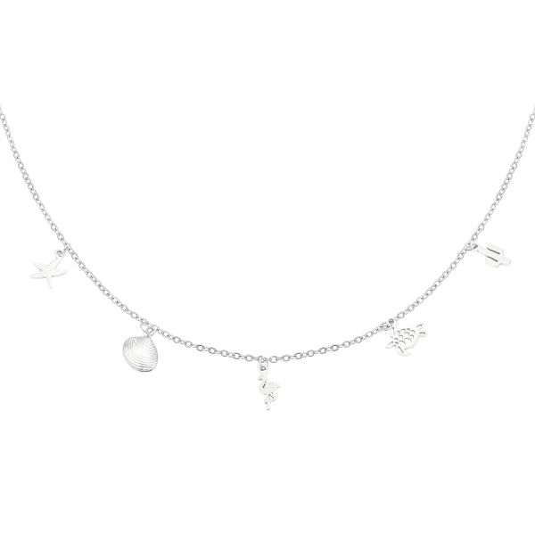 Fijn (1 mm) kort kettinkje met bedeltjes eraan zoals een Flamingo, Cactus, Zeester, Schelp en een Zeeschildpad. Leuk en zomers item en ook leuk om te layeren met andere kettinkjes. Van stainless steel zodat hij mooi blijft!