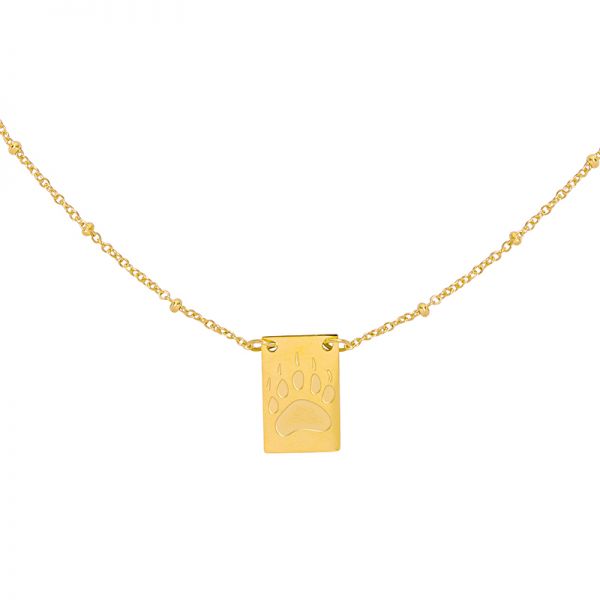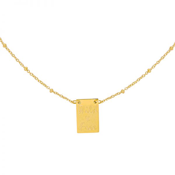 Fijne (1,5 mm) ketting met bolletjes tussen de schakeltjes met een langwerpig hangertje met een afbeelding van een pootje en de quote Wild & Free .