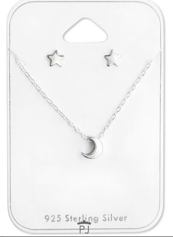 Fijn (1 mm) 925 sterling zilveren kettinkje met klein maantje, deze is echt minimalistisch te noemen! Ook zit er een setje zilveren studs (oorstekers) met sterretjes bij.