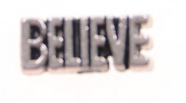 Klein bedeltje voor in de Memory Lockets in zilverkl. met letters Believe erop, afmeting 8 x 3 mm.