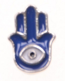 Klein bedeltje voor in de Memory Lockets in de vorm van een zilverkl. met blauw hamsa handje (gelukshandje) , afmeting 9 x 5  mm.