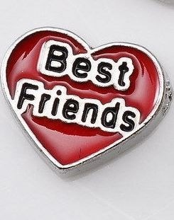 Klein bedeltje voor in de Memory Lockets in de vorm van een rood met zilverkl. hart met in zwart Best Friend, afmeting 9 x 9 mm.