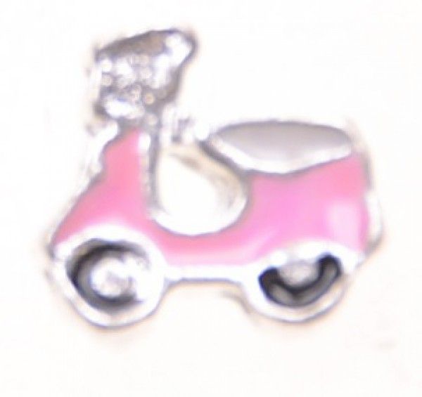 Klein bedeltje voor in de Memory Lockets in de vorm van een zilverkl. met roze scooter , afmeting 8 x 8 mm.