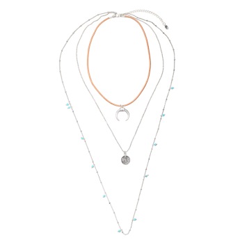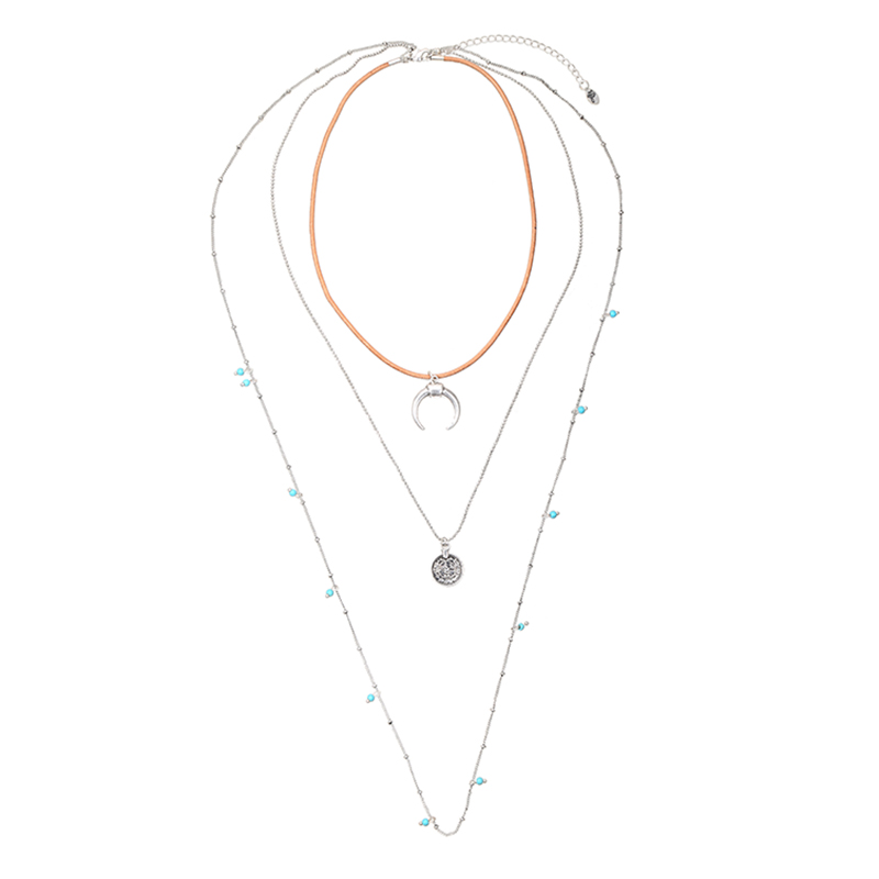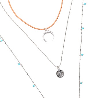 Deze Boho ketting bestaat uit drie lagen kettingen met oa een Buffalo eraan. De 1e laag, de kortste (36 cm) is een bruin leren koordje met gestileerde Buffalo hoorn. De 2e laag (55 cm) is een fijne bolletjesketting(1mm) met een muntje eraan en de langste (85 cm) is een fijne ketting met bolletjes en turquoise kraaltjes over de gehele ketting.
