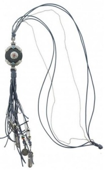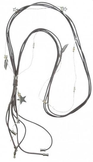 Lange ketting van grijs suèdelook koord samen met een ketting van kleine zilveren glaskraaltjes, met kleine sterretjes, kralen en metalen veertjes over de ketting verdeeld.