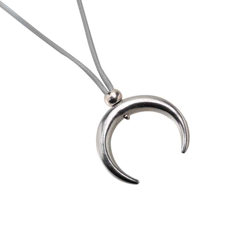 Deze lange ketting bestaat uit een dik (4 mm) lichtgrijs glanskoord met als hanger een serieus grote maan, oftewel Big Moon! Het koord zelf is verstelbaar in lengte dmv een schuif-sluiting.