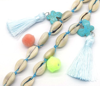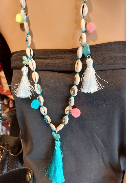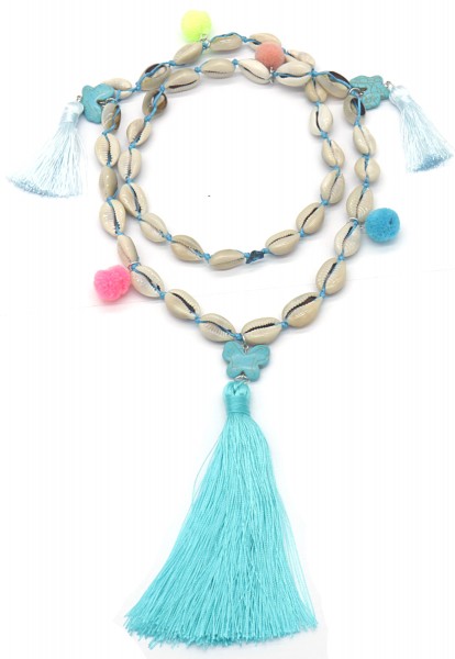 Lange boho ketting bestaande uit vele schelpen op koord met pompons en turquoise vlinders met lichtblauwe kwastjes . Onderaan hangt een grote kwast met turquoise vlinder erboven.
