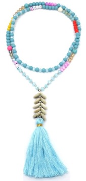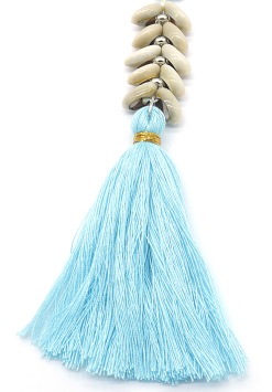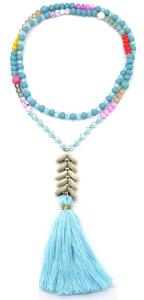 Lange boho ketting bestaande uit vele kralen en facetkralen in turquoise en andere kleuren. Onderaan hangt een grote lichtblauwe kwast met schelpen erboven.