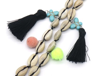 Lange boho ketting bestaande uit vele schelpen op koord met pompons en turquoise vlinders met zwarte kwastjes . Onderaan hangt een grote zwarte kwast met turquoise vlinder erboven.