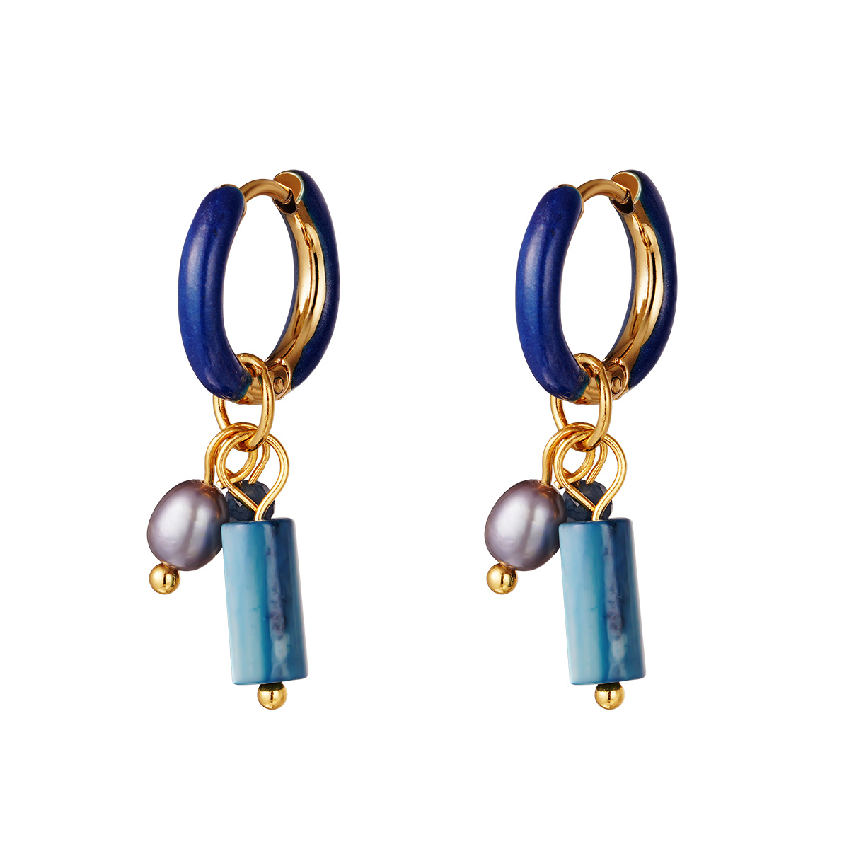 Deze oorbellen bestaan uit 2 mm dikke blauwe emaille-goudkleurige hoops ofwel oorringen van 15 mm met daaraan kraaltjes, een grijze parel en een blauwe natuursteen, het metaal is van stainless steel zodat ze lang mooi blijven.
