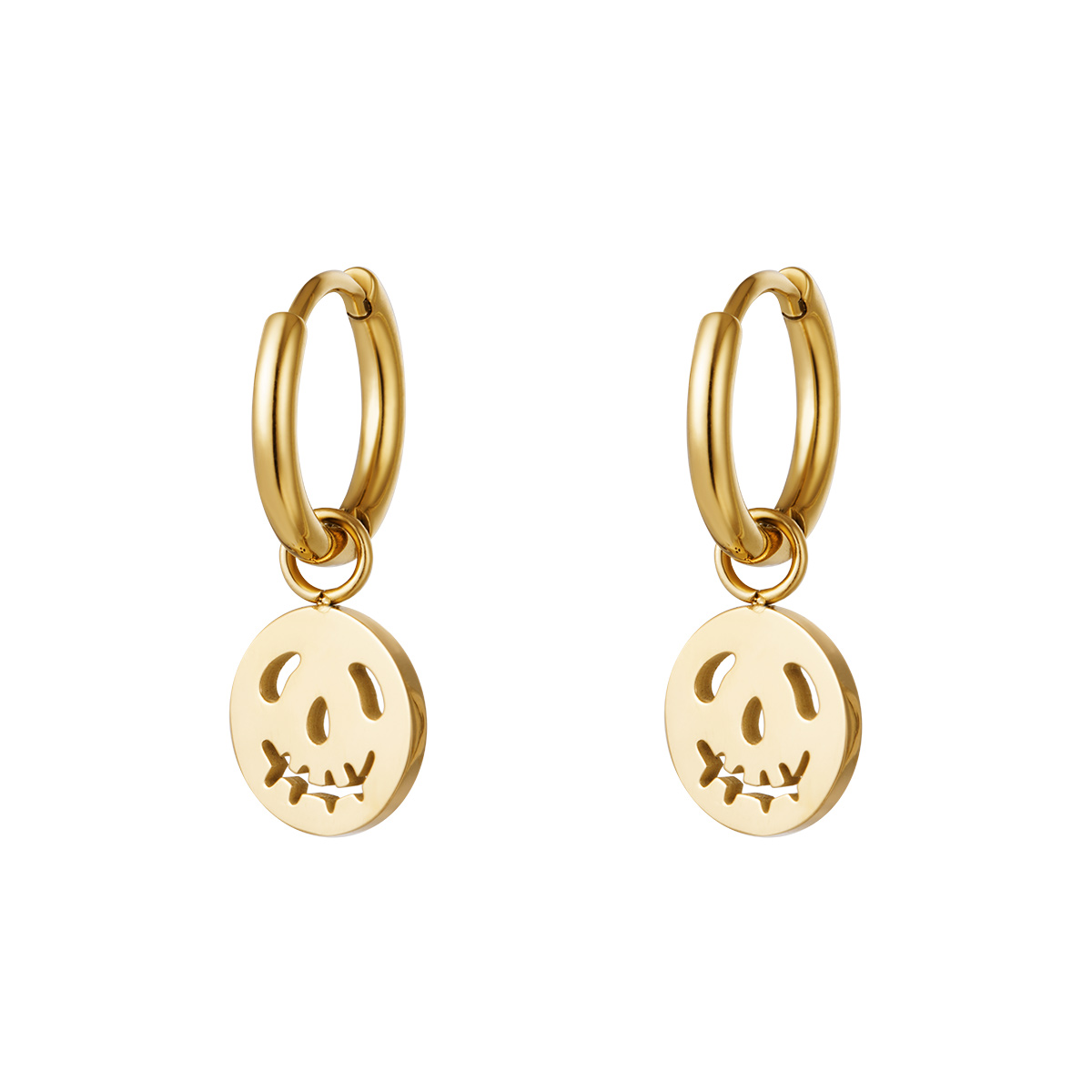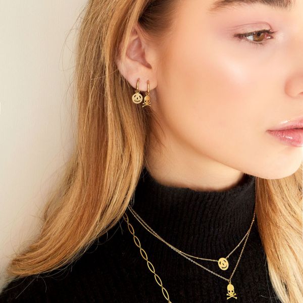 Deze oorbellen bestaan uit kleine hoops ofwel oorringen van 9 mm met daaraan een pompoen met enge grijns in goud, het metaal is van stainless steel zodat ze lang mooi blijven.
