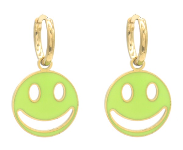 Deze oorbellen bestaan uit kleine hoops ofwel oorringen van 9 mm met daaraan een Smiley in fluo-groen emaille op goud, van stainless steel zodat ze lang mooi blijven.