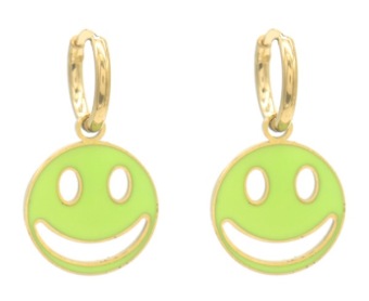 Deze oorbellen bestaan uit kleine hoops ofwel oorringen van 9 mm met daaraan een Smiley in fluo-groen emaille op goud, van stainless steel zodat ze lang mooi blijven. Van deze oorbellen moet je toch vanzelf glimlachen?