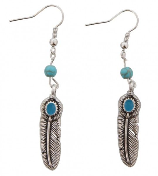 Deze Boho oorbellen hebben de vorm van een veertje en zijn  van zilverkleurig metaal met een klein turqoise vlak en kraaltje.