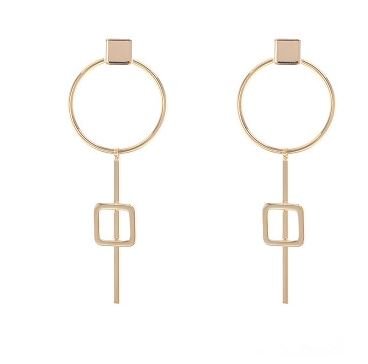Deze oorbellen hebben een strakke geometrische vorm van een soort sleutel, met cirkel en 2 vierkanten in goudkleurig metaal, apart van Yehwang!
