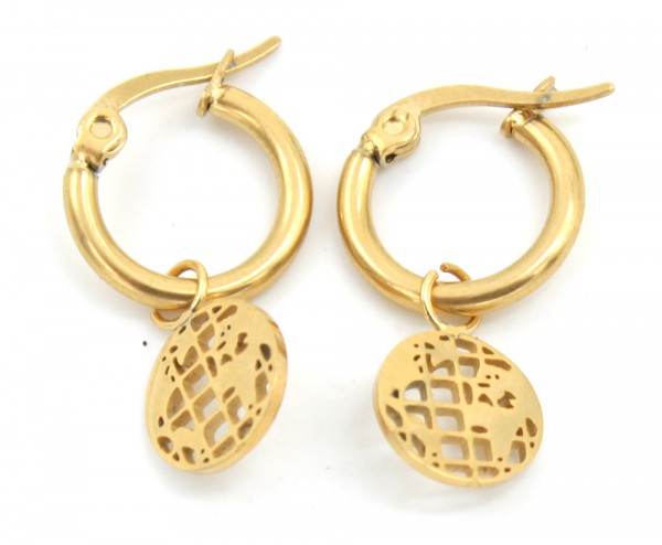 Deze goudkleurige oorbellen bestaan uit kleine (2 mm dik) creolen of ringen met daaraan een gestileerde wereldbol oftewel globe. Van stainless steel, blijft dus mooi. Hier zijn ook een armband en een ketting van verkrijgbaar!
