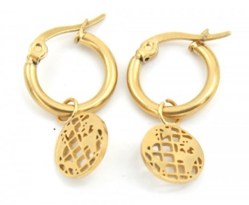 Deze goudkleurige oorbellen bestaan uit kleine (2 mm dik) creolen of ringen van 12 mm doorsnee met daaraan een gestileerde wereldbol oftewel globe.