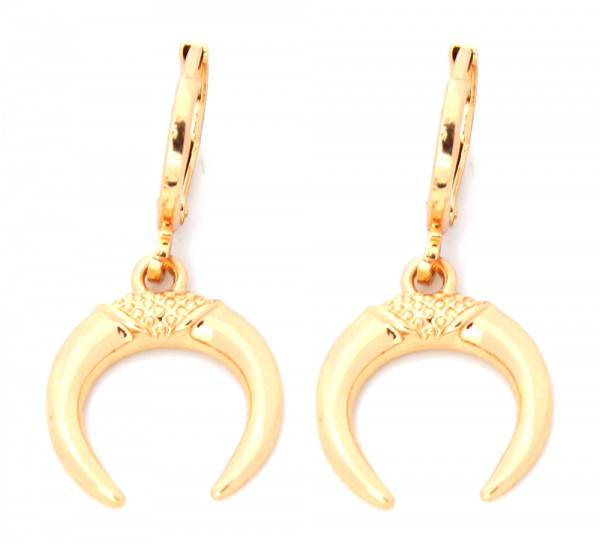Deze goudkleurige oorbellen bestaan uit kleine creolen oftewel ringen (10 mm) met daaraan als bedel een maantje.