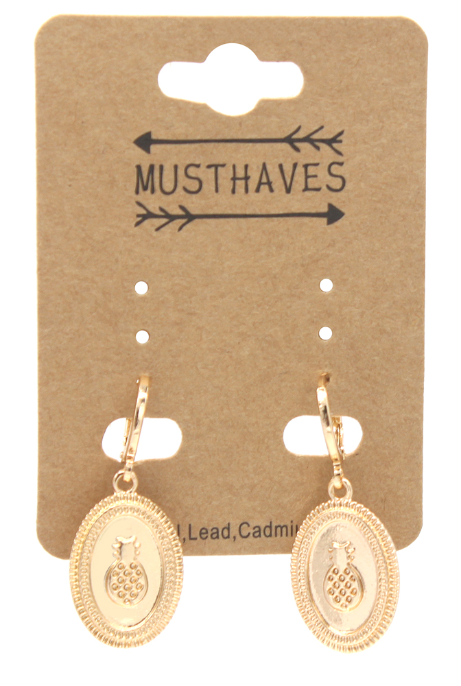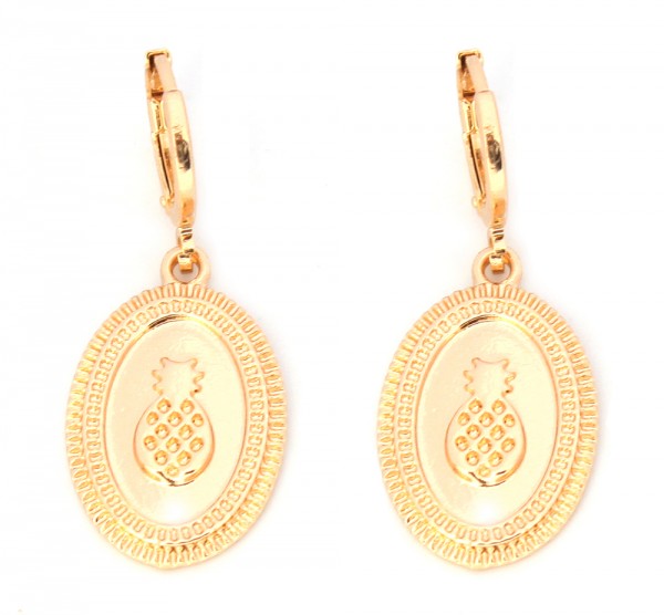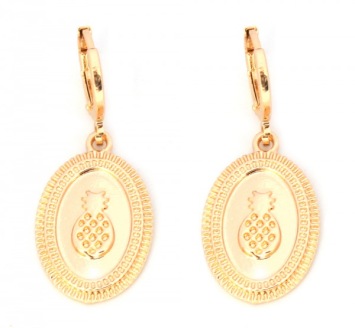 Deze goudkleurige oorbellen bestaan uit kleine creolen of ringen (10 mm) met daaraan een ovale bedel met een Ananas oftewel Pineapple er op.