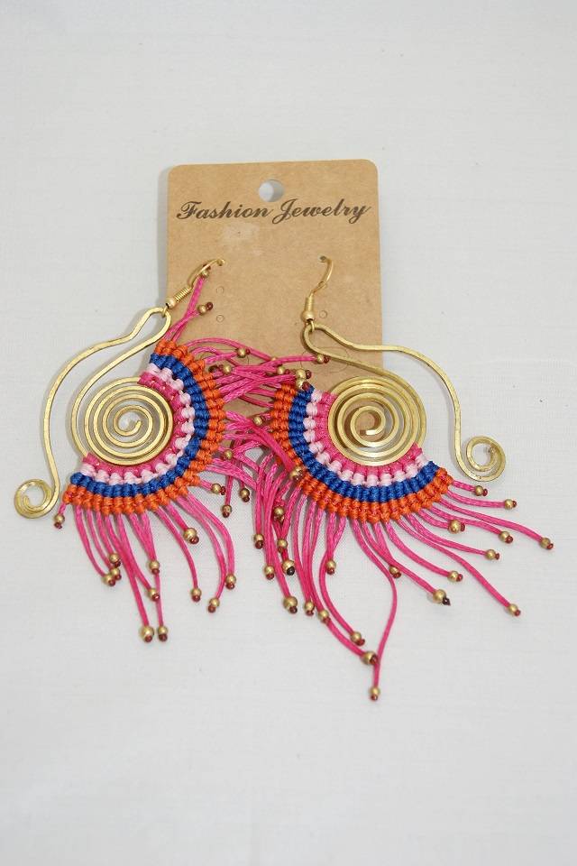 Opvallende oorbellen van Ibiza Originals, met de kenmerkende sierlijke vintage oud-goudkleurige krullen en verder volledig met de hand doorgeknoopt met vooral fuchsia-roze en meerdere kleurtjes zoals roze, blauw en oranje. Deze hebben nog franjes en kraaltjes aan het uiteinde, apart!