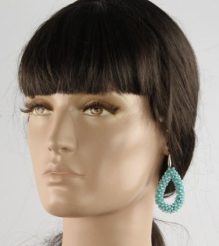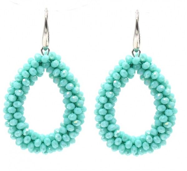Mooie oorbellen bestaande uit zilveren haakjes met druppelvormige hangers met honderden glans kraaltjes in turqoise.