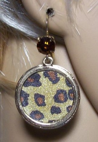 Deze oorbellen bestaan uit een haakje met daaraan een cognac-kleurige strass-steen met goudkleurig rondje met tijger-print.