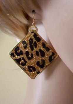 Deze goudkleurige oorbellen bestaan uit een haakje met daaraan een vierkant met Tiger-print in glitter-goud-zwart. Deze oorbellen zijn niet zwaar en ong. 7 cm lang.