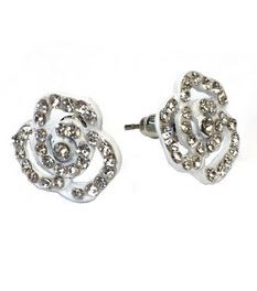 Oorstekers van opengewerkt metaal in de vorm van een witte roos met strass-steentjes, groote ong. 15 mm doorsnee.