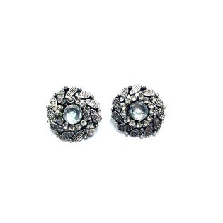 Kleine oorstekers bestaande uit een zilverkleurige bloemenrand met in het midden meerdere strass-steentjes, grootte ong. 15 mm doorsnee.