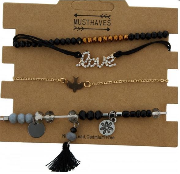 Set van 4 fijne armbandjes in een voor een leuke prijs! Van de armbandjes zijn er 2 elastisch met verschillend gekleurde facetkralen. Aan 1 armbandje hangt een zwart kwastje. De andere 2 armbandjes zijn verstelbaar waaronder 1 goudkleurig schakelbandje met vogeltje en 1 zwart koord armbandje met Love.