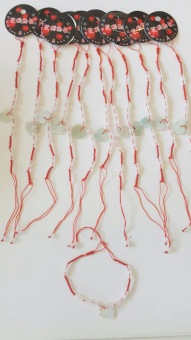 Materiaal; Metaal, glaskralen, koord.