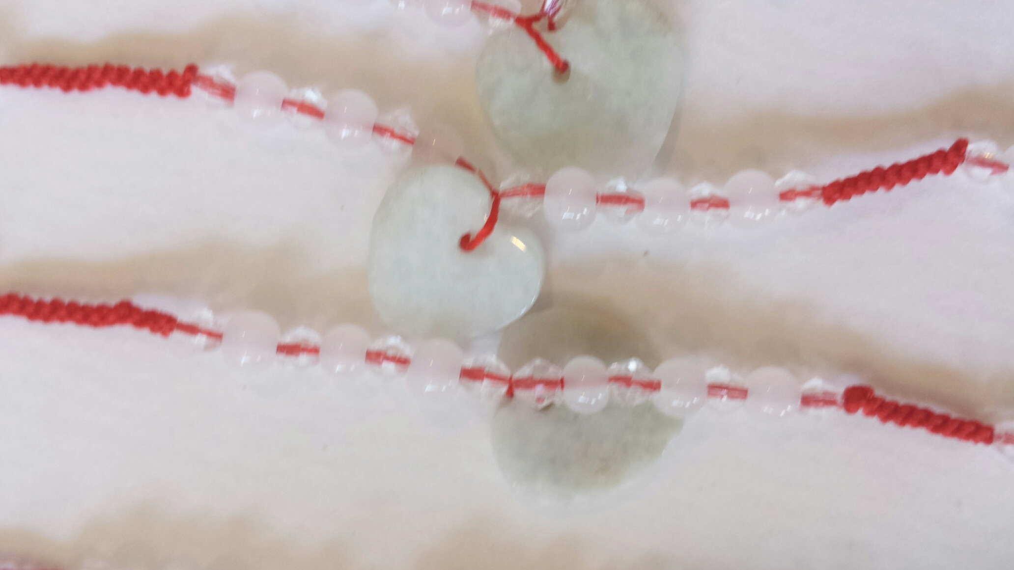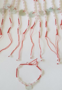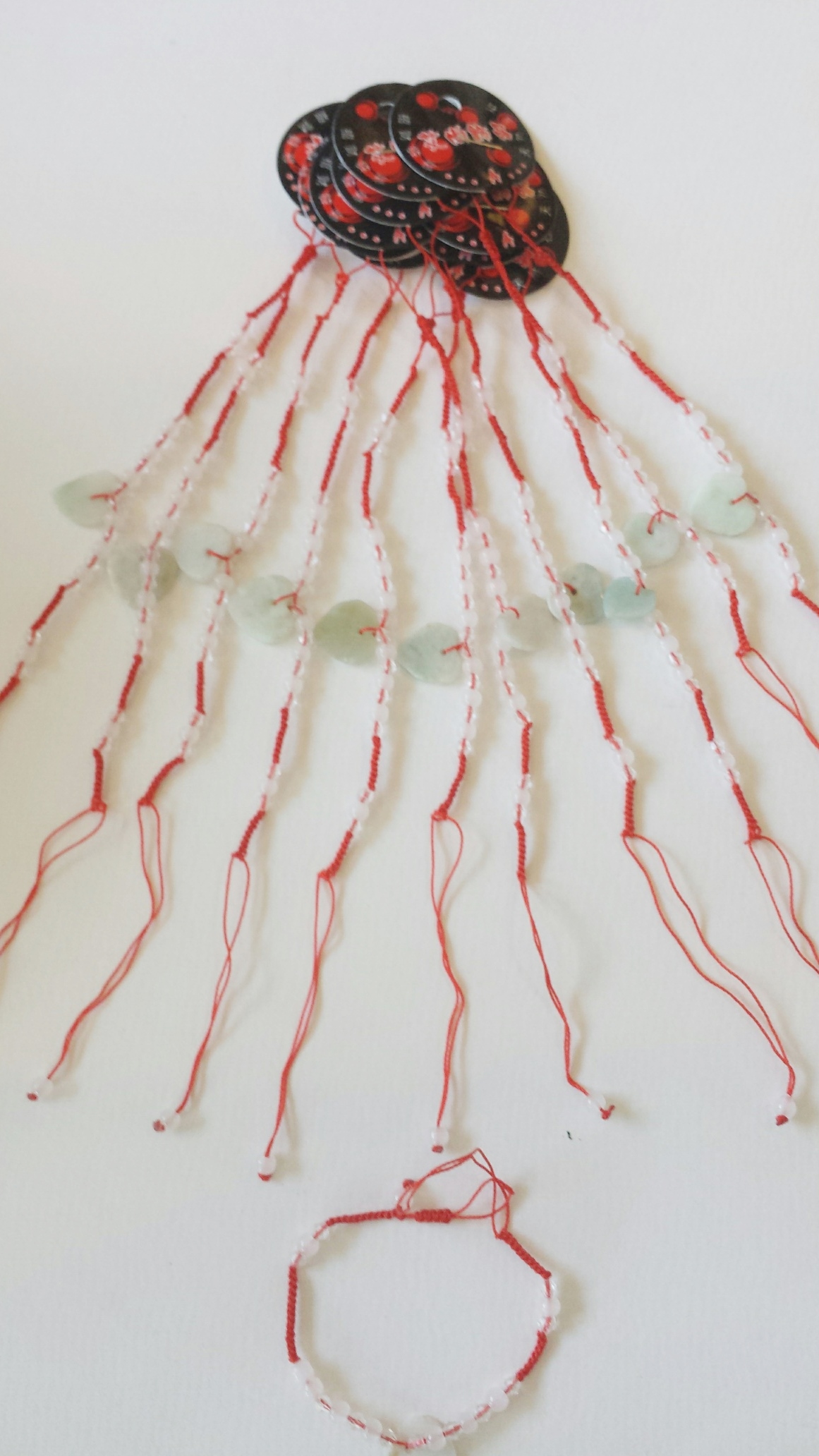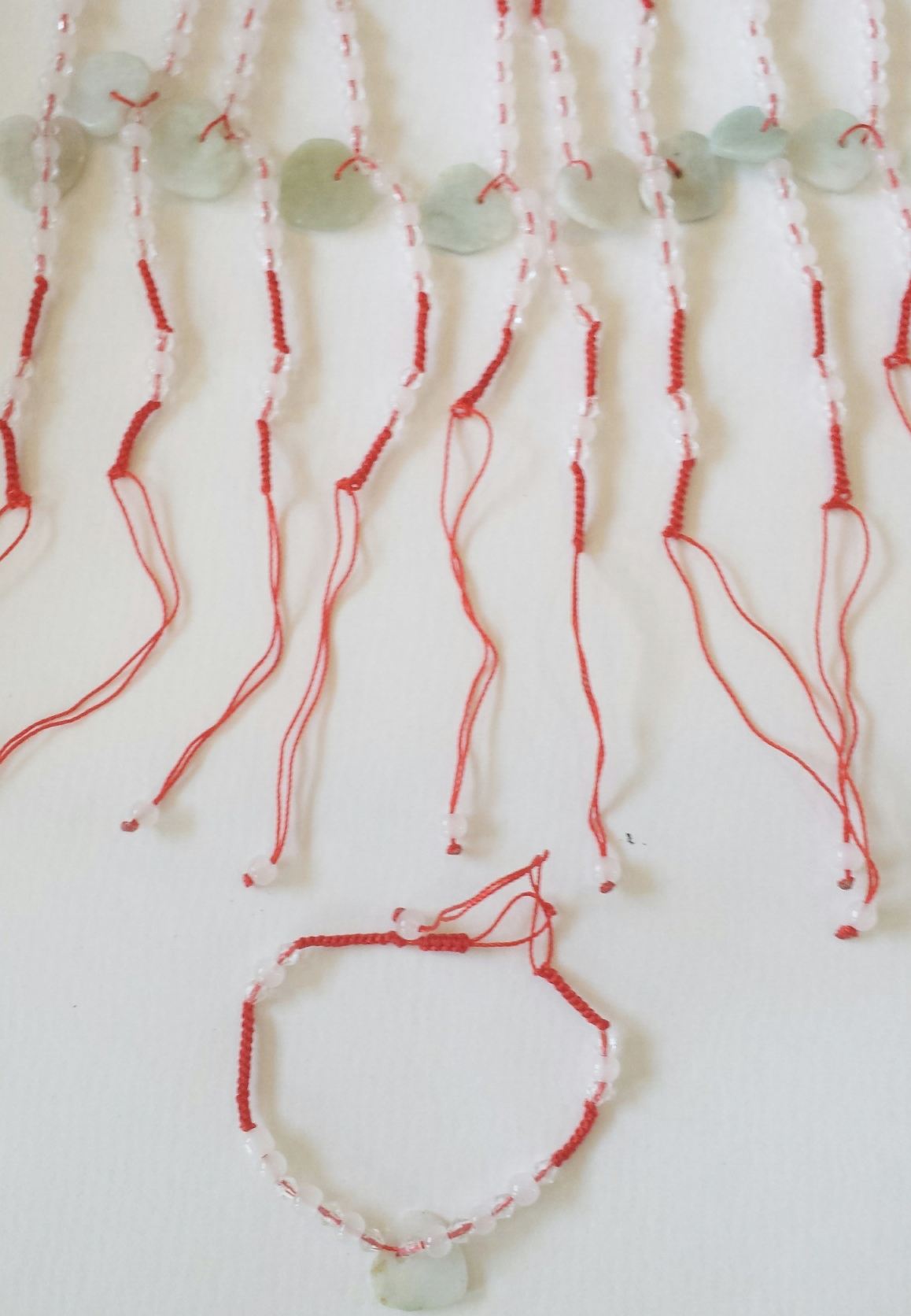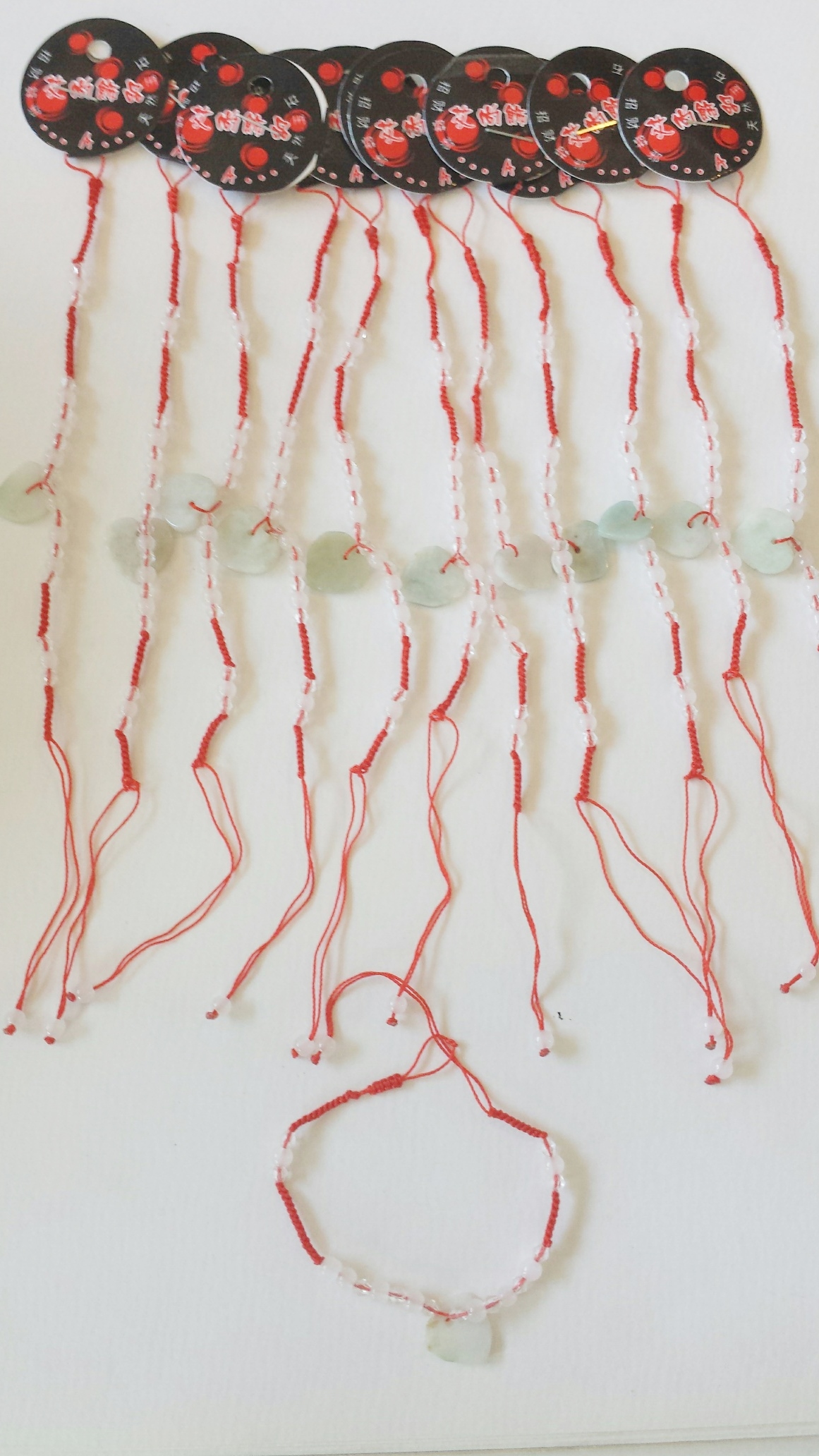 Deze set bevat 12 Lucky Bracelets (geluksarmbandjes)van fijn (1mm) rood koord welke in macramé zijn geknoopt met glazen kralen ertussen en een groen jade hartje in het midden.