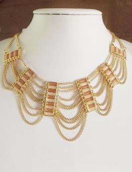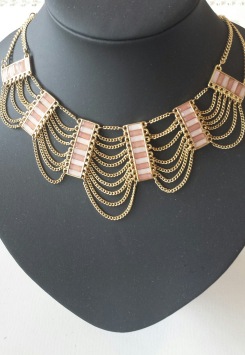 Deze korte ketting bestaat uit fijne goudkleurige kettinkjes onder elkaar, welke verdeeld worden met tussenstukjes met roze en nude-kleurige langwerpige kralen er op.